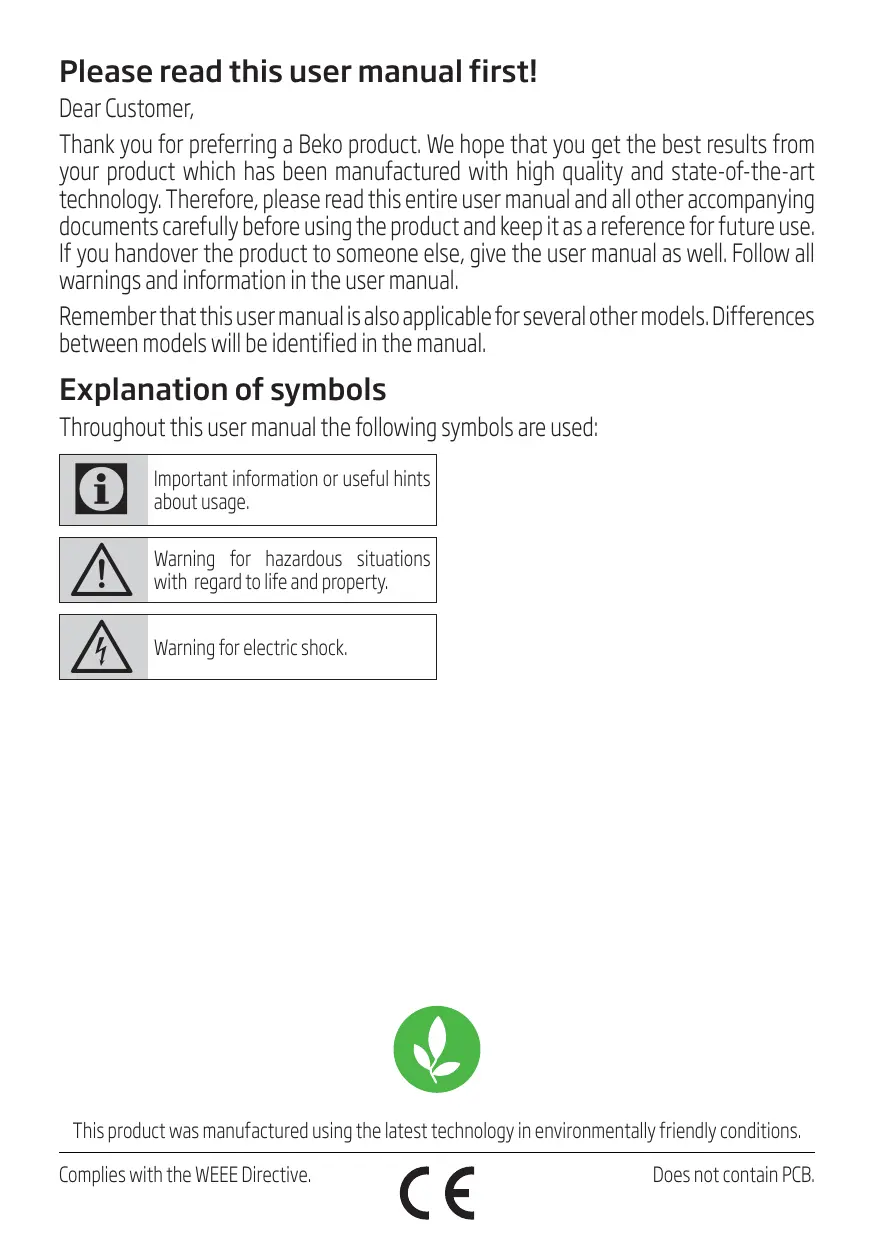 Dear Customer, Thank you for preferring a Beko product. We hope that you get the best results from your product which has been manufactured with high quality and state-of-the-art technology. Therefore, please read this entire user manual and all other accompanying documents carefully before using the product and keep it as a reference for future use. If you handover the product to someone else, give the user manual as well. Follow all warnings and information in the user manual. Remember that this user manual is also applicable for several other models. Differences between models will be identified in the manual.