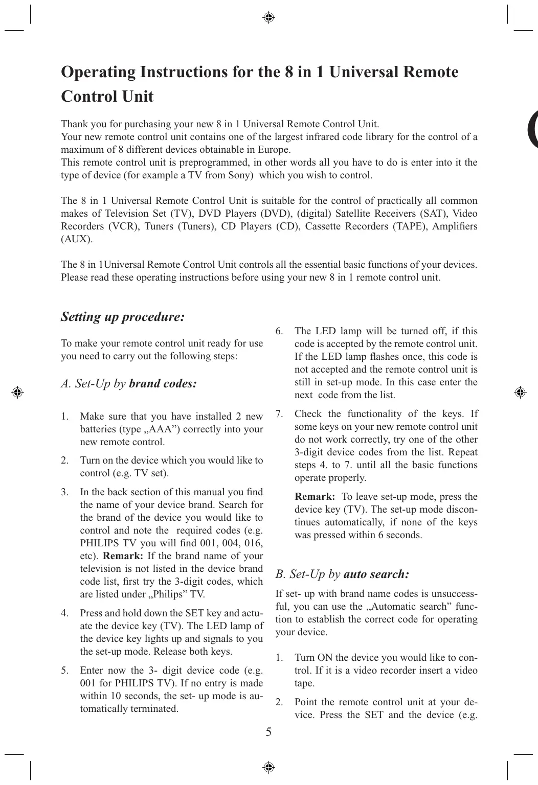 VCR CBL/SAT DVD Operating Instructions for the 8 in 1 Universal Remote Control Unit Thank you for purchasing your new 8 in 1 Universal Remote Control Unit. Your new remote control unit contains one of the largest infrared code library for the control of a maximum of 8 different devices obtainable in Europe. This remote control unit is preprogrammed, in other words all you have to do is enter into it the type of device (for example a TV from Sony) which you wish to control. The 8 in 1 Universal Remote Control Unit is suitable for the control of practically all common makes of Television Set (TV), DVD Players (DVD), (digital) Satellite Receivers (SAT), Video Recorders (VCR), Tuners (Tuners), CD Players (CD), Cassette Recorders (TAPE), Amplifiers (AUX). The 8 in 1Universal Remote Control Unit controls all the essential basic functions of your devices. Please read these operating instructions before using your new 8 in 1 remote control unit. Setting up procedure: To make your remote control unit ready for use you need to carry out the following steps: