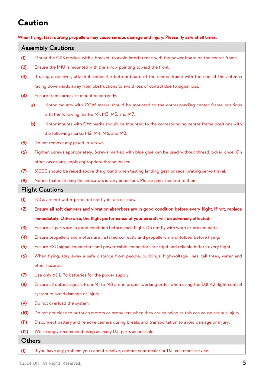 Disclaimer Thank you for purchasing this DJI product. Please visit the S1000 page on www.dji.com regularly to keep up with product information, technical updates and manual corrections. Information in this manual is subject to change without notice in line with product upgrades and updates. In using this product, you hereby agree to this disclaimer and signify that you have understood all points completely. When assembling this product, follow all instructions carefully. The manufacturer and seller assume no liability for any damage or injury arising from the use of this product. DJI is a registered trademark of DJI Innovations. Names of product, brand, etc., appearing in this manual are trademarks or registered trademarks of their respective owner companies. This product and manual are copyrighted by DJI Innovations with all rights reserved. No part of this product or manual shall be reproduced in any form without the prior written consent or authorization of DJI Innovations. No patent liability is assumed with respect to the use of the product or information contained herein.