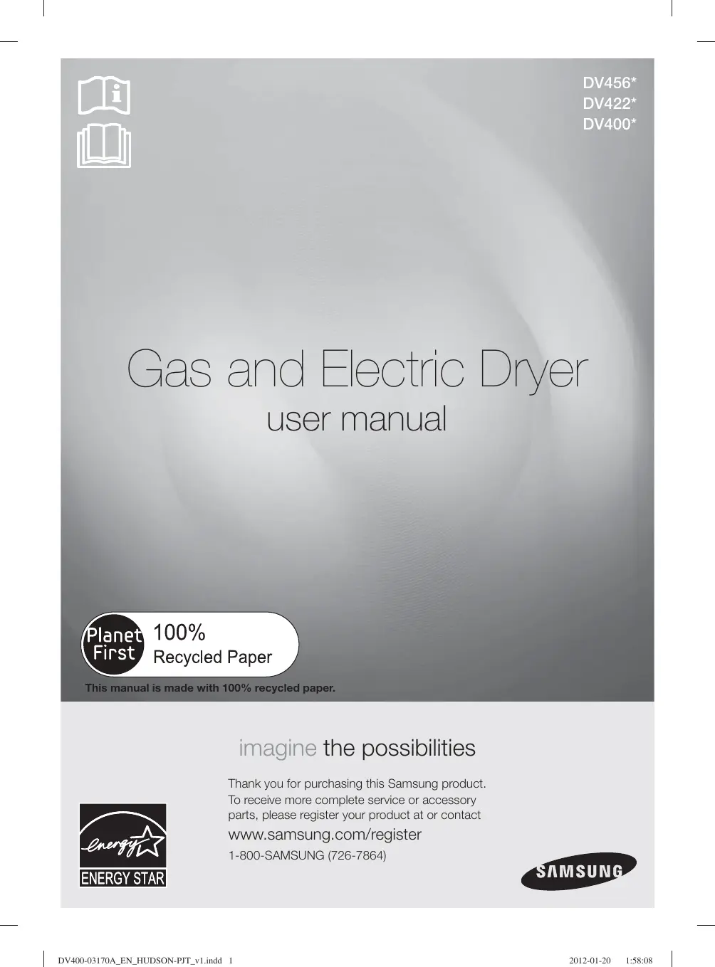 Gas and Electric Dryer user manual This manual is made with 100% recycled paper. imagine the possibilities Thank you for purchasing this Samsung product. To receive more complete service or accessory parts, please register your product at or contact features