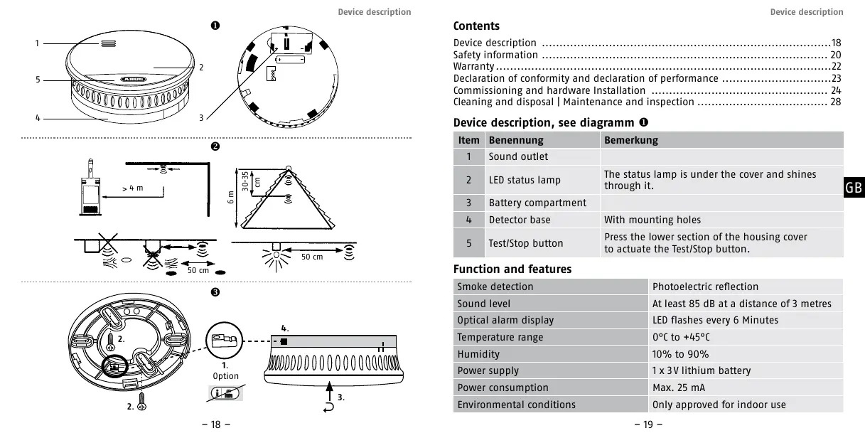 Smoke detection Photoelectric reflection Sound level At least 85 dB at a distance of 3 metres Optical alarm display LED flashes every 6 Minutes Temperature range 0°C to +45°C Humidity 10% to 90% Power supply 1 x 3 V lithium battery Power consumption Max. 25 mA Environmental conditions Only approved for indoor use – 19 –