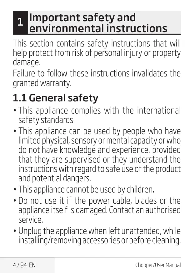 - Remove bones and stones from food to prevent the blades and the appliance from getting damaged. Chopper/User Manual 5 / 94 EN 1 I mportant safety and environmental instructions