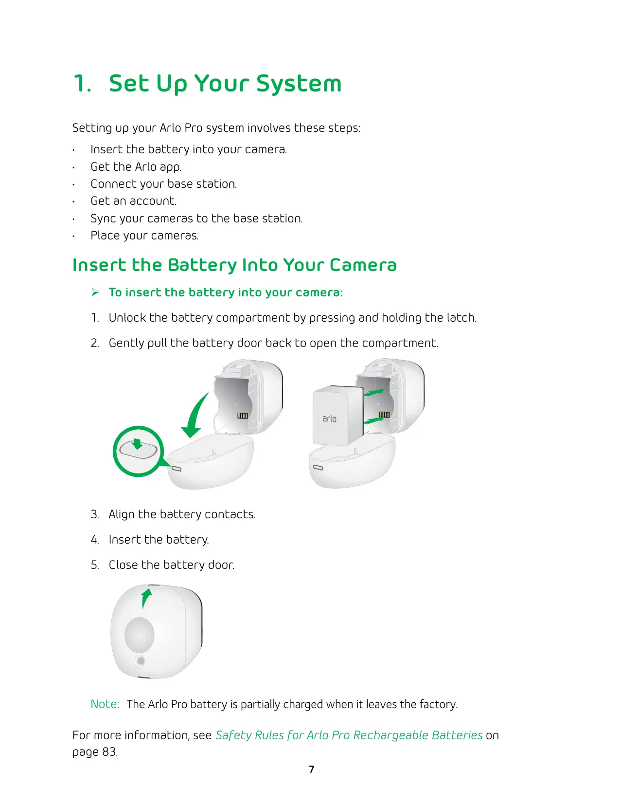 Note: The Arlo Pro battery is partially charged when it leaves the factory. For more information, see Safety Rules for Arlo Pro Rechargeable Batteries on page 83.