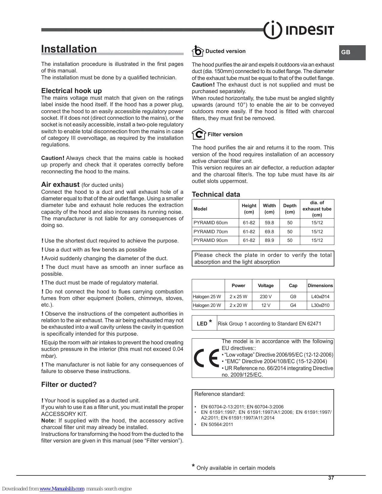 The documents indicates that the product may not be treated as domestic waste but must be handed over to a sorting centre for electrical and electronic waste. Dispose of it in accordance with local waste disposal regulations. For further information on the handling, recovery and recycling of this product, contact the local authority, domestic waste disposal service or the reseller from whom you purchased it Save energy and respect the environment • Please use the hood by setting the speed in line with the real extraction need; please limit the use of the “intensive speed” feature, if present. Using the hood in a rational way allows you to limit energy consumption and to avoid an useless waste of clean and air-conditioned air. • Please don’t turn on the hood light unless this is needed to light the cooking area.