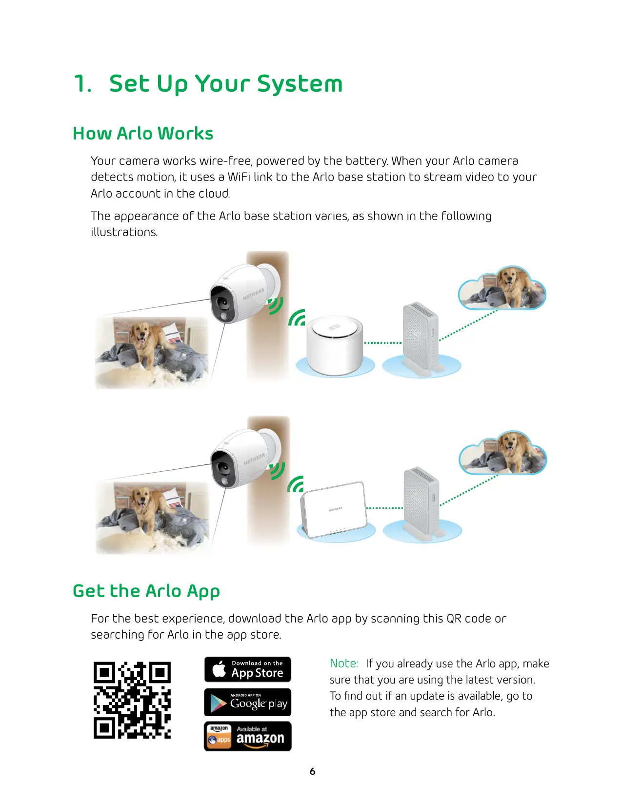 How Arlo Works Your camera works wire-free, powered by the battery. When your Arlo camera detects motion, it uses a WiFi link to the Arlo base station to stream video to your Arlo account in the cloud. The appearance of the Arlo base station varies, as shown in the following illustrations. Get the Arlo App For the best experience, download the Arlo app by scanning this QR code or searching for Arlo in the app store. Note: If you already use the Arlo app, make sure that you are using the latest version. To find out if an update is available, go to the app store and search for Arlo.