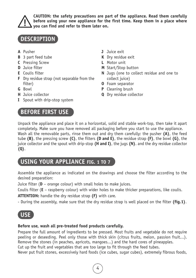 Assemble the appliance as indicated on the drawings and choose the filter according to the desired preparation: Juice filter (D – orange colour) with small holes to make juices. Coulis filter (E – raspberry colour) with wider holes to make thicker preparations, like coulis. ATTENTION: handle the dry residue strap (F) with care. - During the assembly, make sure that the dry residue strap is well placed on the filter (fig.1). USE Before use, wash all pre-treated food products carefully. Prepare the full amount of ingredients to be pressed. Most fruits and vegetable do not require peeling or deseeding. Peel only those with thick skin (citrus fruits, melon, passion fruit...). Remove the stones (in peaches, apricots, mangoes...) and the hard cores of pineapples. Cut up the fruit and vegetables that are too large to fit through the feed tubes. Never put fruit stones, excessively hard foods (ice cubes, sugar cubes), extremely fibrous foods,