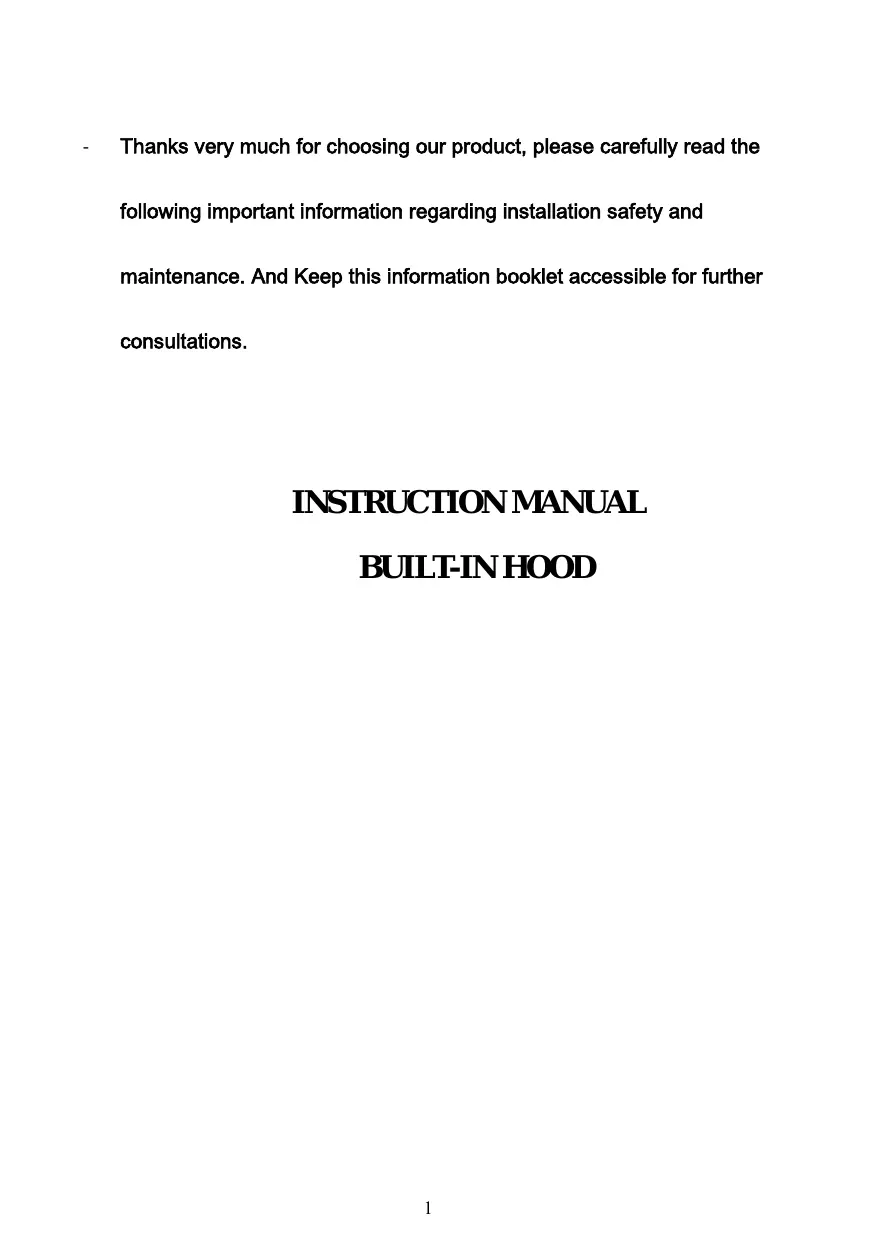 Thanks very much for choosing our product, please carefully read the following important information regarding installation safety and maintenance. And Keep this information booklet accessible for further consultations. INSTRUCTION MANUAL BUILT-IN HOOD