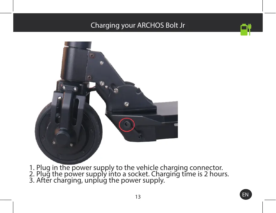 1. Plug in the power supply to the vehicle charging connector. 2. Plug the power supply into a socket. Charging time is 2 hours. 3. After charging, unplug the power supply. 13