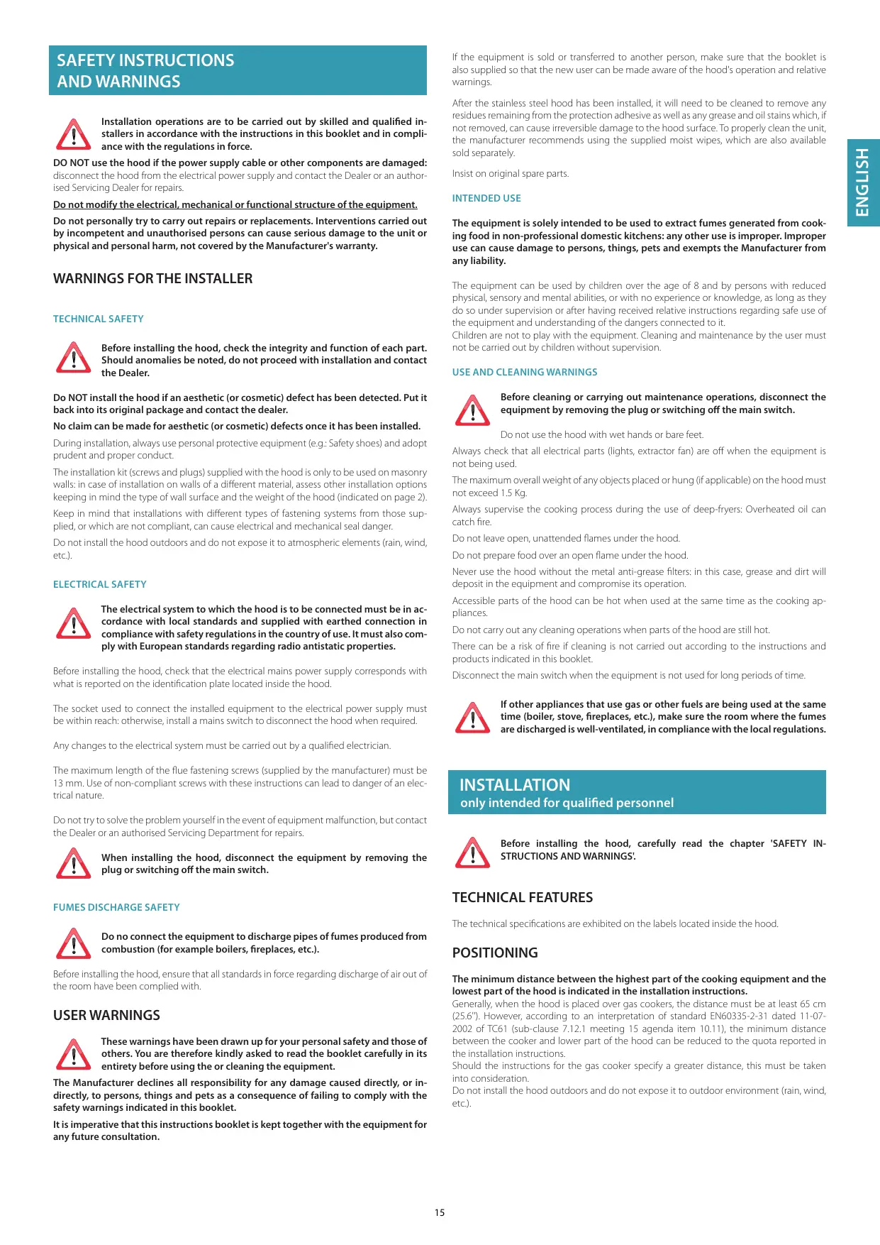 The equipment can be used by children over the age of 8 and by persons with reduced physical, sensory and mental abilities, or with no experience or knowledge, as long as they do so under supervision or after having received relative instructions regarding safe use of the equipment and understanding of the dangers connected to it. Children are not to play with the equipment. Cleaning and maintenance by the user must not be carried out by children without supervision. TECHNICAL SAFETY Before installing the hood, check the integrity and function of each part. Should anomalies be noted, do not proceed with installation and contact the Dealer.