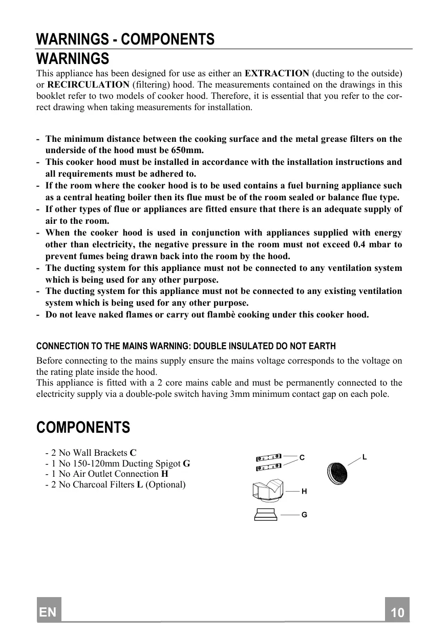 This appliance has been designed for use as either an EXTRACTION (ducting to the outside) or RECIRCULATION (filtering) hood. The measurements contained on the drawings in this booklet refer to two models of cooker hood. Therefore, it is essential that you refer to the correct drawing when taking measurements for installation.
