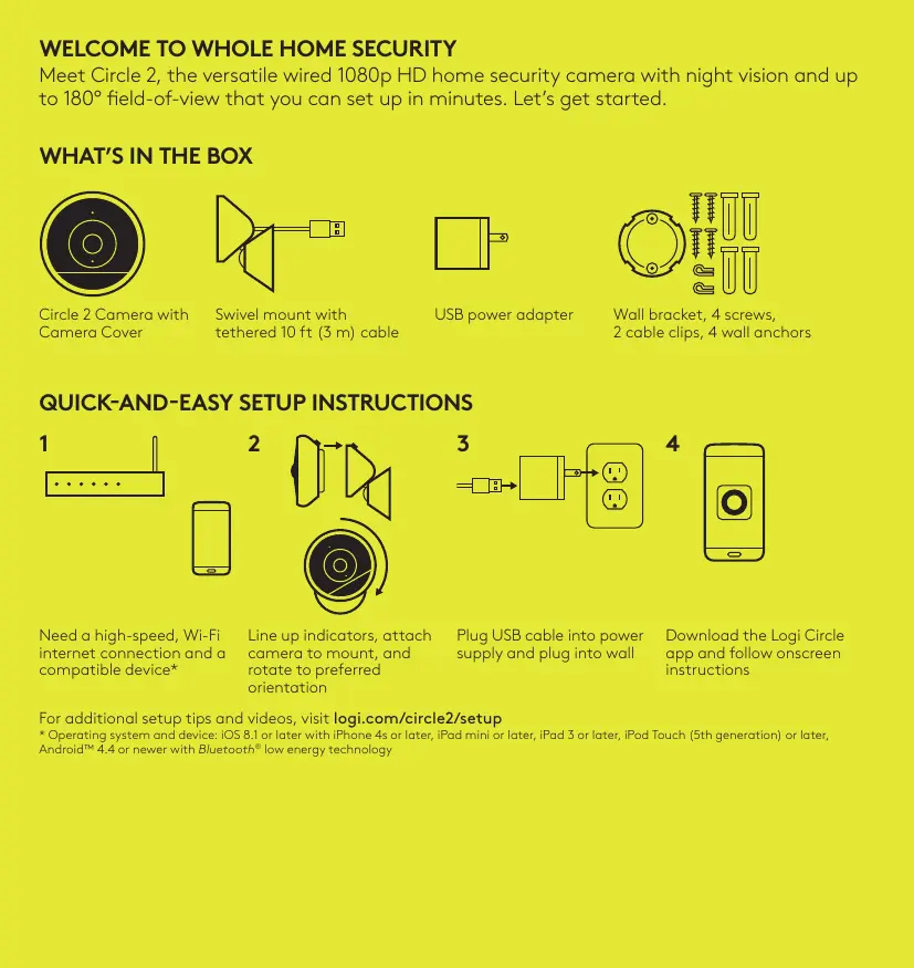 Meet Circle 2, the versatile wired 1080p HD home security camera with night vision and up to 180° field-of-view that you can set up in minutes. Let’s get started. Circle 2 Camera with Camera Cover Swivel mount with tethered 10 ft (3 m) cable USB power adapter Wall bracket, 4 screws, 2 cable clips, 4 wall anchors