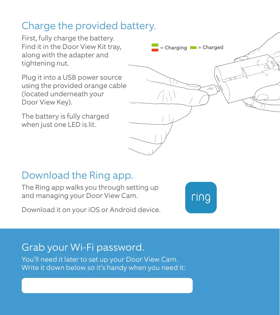 Door View Cam Model: G63R9A Charge the provided battery. First, fully charge the battery. Find it in the Door View Kit tray, along with the adapter and tightening nut. = Charging Plug it into a USB power source using the provided orange cable (located underneath your Door View Key). The battery is fully charged when just one LED is lit. Download the Ring app. The Ring app walks you through setting up and managing your Door View Cam. Download it on your iOS or Android device. Grab your Wi-Fi password. You’ll need it later to set up your Door View Cam. Write it down below so it’s handy when you need it: = Charged Clean up any paint. If your peephole was painted over, you may have to remove the excess in order to unscrew it (if not, skip ahead). Check for paint on or around your peephole, both indoors and outdoors. Use the toothed edge of the Door View Key to carefully remove paint covering the edges or slots. Remove the indoor half. On the indoor side, place the flat edge of the Door View Key into the slots on your peephole and rotate counter-clockwise to unscrew it. Once it’s loose enough, you can use your fingers to finish unscrewing it and remove it completely. You may have to secure the outdoor side of the peephole while unscrewing the indoor portion to keep it from spinning. Remove the outdoor half. With the indoor side removed, the outdoor portion should slide right out. In the event that it doesn’t, check again for paint or other obstructions around the lens. If this isn’t your forever home, consider storing the peephole in a safe place in case you have to re-install it one day.