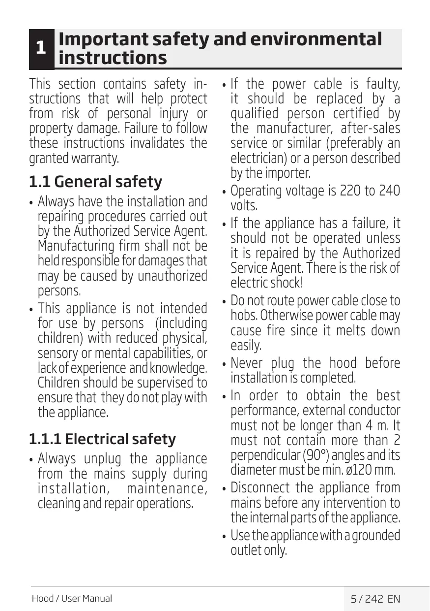 the power cable is faulty, it should be replaced by a qualified person certified by the manufacturer, after-sales service or similar (preferably an electrician) or a person described by the importer. •• Operating voltage is 220 to 240 volts. •• If the appliance has a failure, it should not be operated unless it is repaired by the Authorized Service Agent. There is the risk of electric shock! •• Do not route power cable close to hobs. Otherwise power cable may cause fire since it melts down easily. •• Never plug the hood before installation is completed. •• In order to obtain the best performance, external conductor must not be longer than 4 m. It must not contain more than 2 perpendicular (90°) angles and its diameter must be min. ø120 mm. •• Disconnect the appliance from mains before any intervention to the internal parts of the appliance. •• Use the appliance with a grounded outlet only. 5 / 242 EN