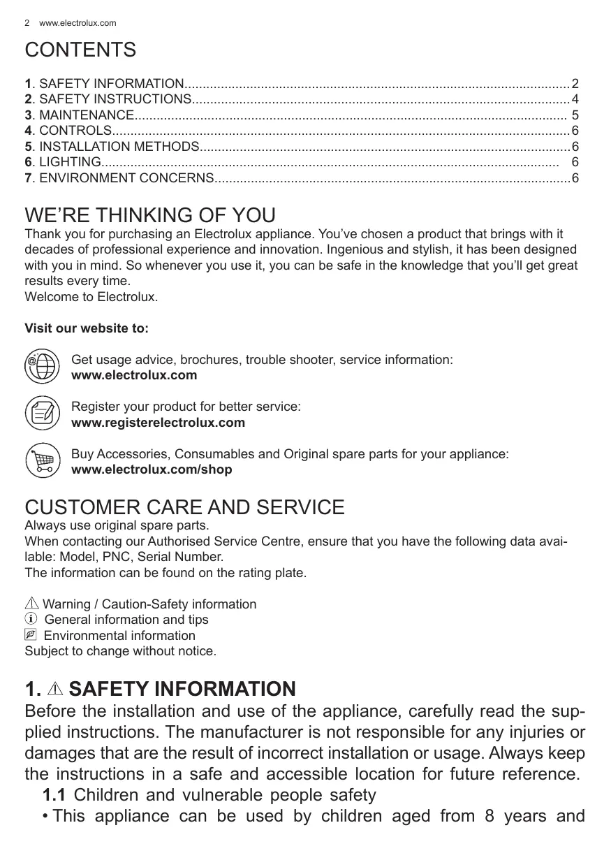 Thank you for purchasing an Electrolux appliance. You've chosen a product that brings with it decades of professional experience and innovation. Ingenious and stylish, it has been designed with you in mind. So whenever you use it, you can be safe in the knowledge that you'll get great results every time. Welcome to Electrolux. NOUBWN= Visit our website to: Get usage advice, brochures, trouble shooter, service information: www.electrolux.com Register your product for better service: www.registerelectrolux.com Buy Accessories, Consumables and Original spare parts for your appliance: www.electrolux.com/shop