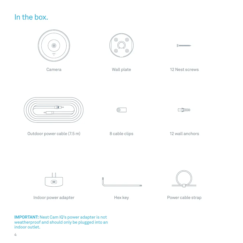 In the box. Camera Wall plate 12 Nest screws Outdoor power cable (7.5 m) 8 cable clips 12 wall anchors Indoor power adapter Hex key Power cable strap IMPORTANT: Nest Cam IQ’s power adapter is not weatherproof and should only be plugged into an indoor outlet.