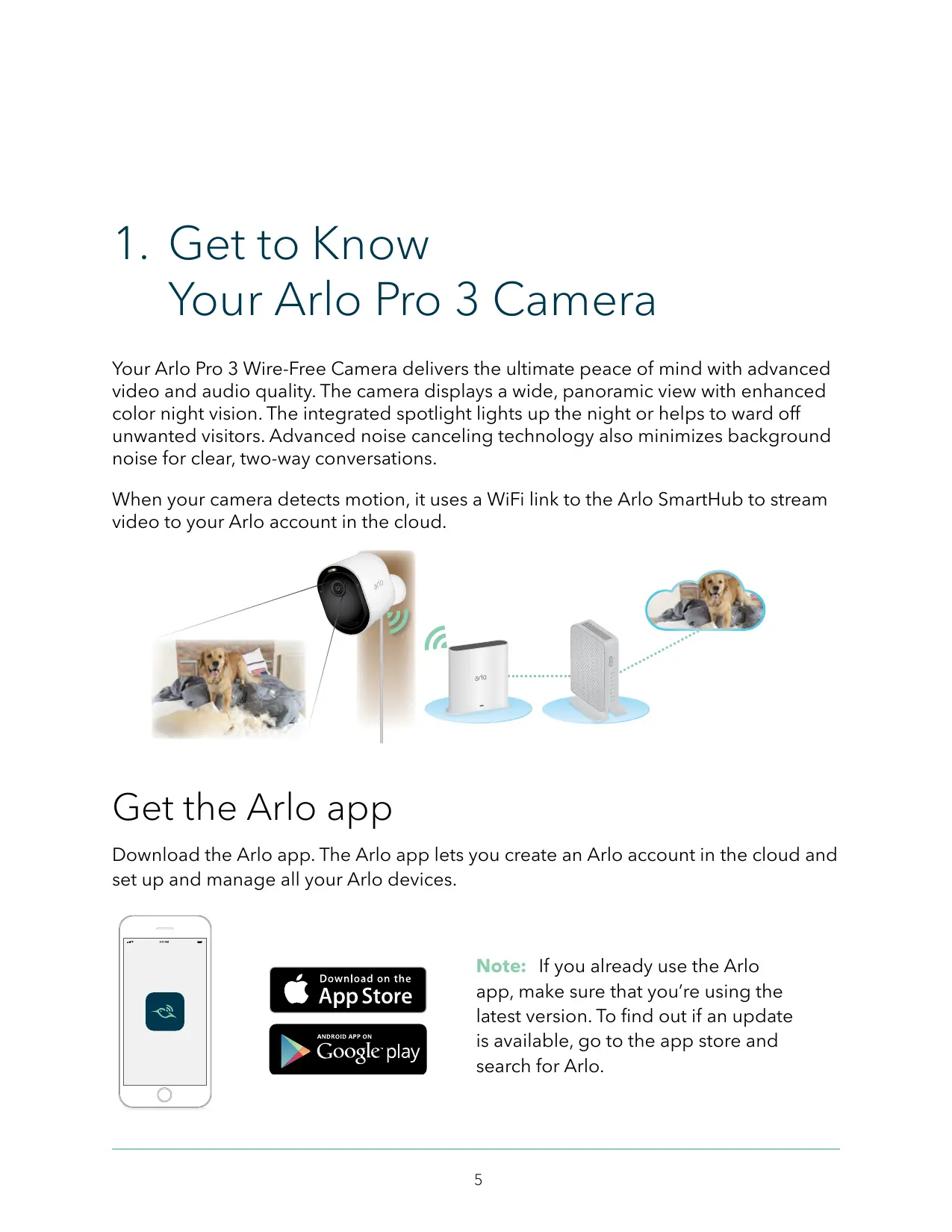 Your Arlo Pro 3 Camera Your Arlo Pro 3 Wire-Free Camera delivers the ultimate peace of mind with advanced video and audio quality. The camera displays a wide, panoramic view with enhanced color night vision. The integrated spotlight lights up the night or helps to ward off unwanted visitors. Advanced noise canceling technology also minimizes background noise for clear, two-way conversations. When your camera detects motion, it uses a WiFi link to the Arlo SmartHub to stream video to your Arlo account in the cloud. Get the Arlo app Download the Arlo app. The Arlo app lets you create an Arlo account in the cloud and set up and manage all your Arlo devices. Note: If you already use the Arlo app, make sure that you’re using the latest version. To find out if an update is available, go to the app store and search for Arlo.