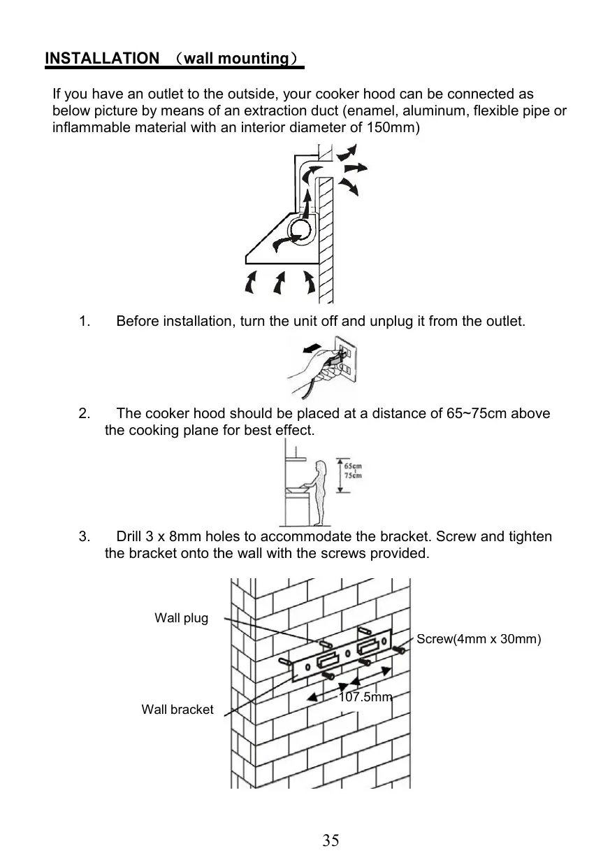 INSTALLATION (wall mounting) If you have an outlet to the outside, your cooker hood can be connected as below picture by means of an extraction duct (enamel, aluminum, flexible pipe or inflammable material with an interior diameter of 150mm)