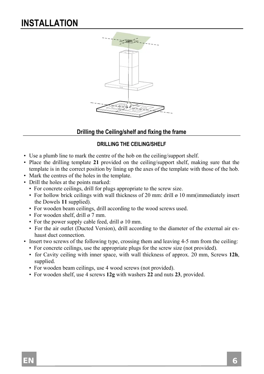 INSTALLATION Drilling the Ceiling/shelf and fixing the frame DRILLING THE CEILING/SHELF • Use a plumb line to mark the centre of the hob on the ceiling/support shelf. • Place the drilling template 21 provided on the ceiling/support shelf, making sure that the template is in the correct position by lining up the axes of the template with those of the hob. • Mark the centres of the holes in the template. • Drill the holes at the points marked: • For concrete ceilings, drill for plugs appropriate to the screw size. • For hollow brick ceilings with wall thickness of 20 mm: drill ø 10 mm(immediately insert the Dowels 11 supplied). • For wooden beam ceilings, drill according to the wood screws used. • For wooden shelf, drill ø 7 mm. • For the power supply cable feed, drill ø 10 mm. • For the air outlet (Ducted Version), drill according to the diameter of the external air exhaust duct connection. • Insert two screws of the following type, crossing them and leaving 4-5 mm from the ceiling: • For concrete ceilings, use the appropriate plugs for the screw size (not provided). • for Cavity ceiling with inner space, with wall thickness of approx. 20 mm, Screws 12h, supplied. • For wooden beam ceilings, use 4 wood screws (not provided). • For wooden shelf, use 4 screws 12g with washers 22 and nuts 23, provided.
