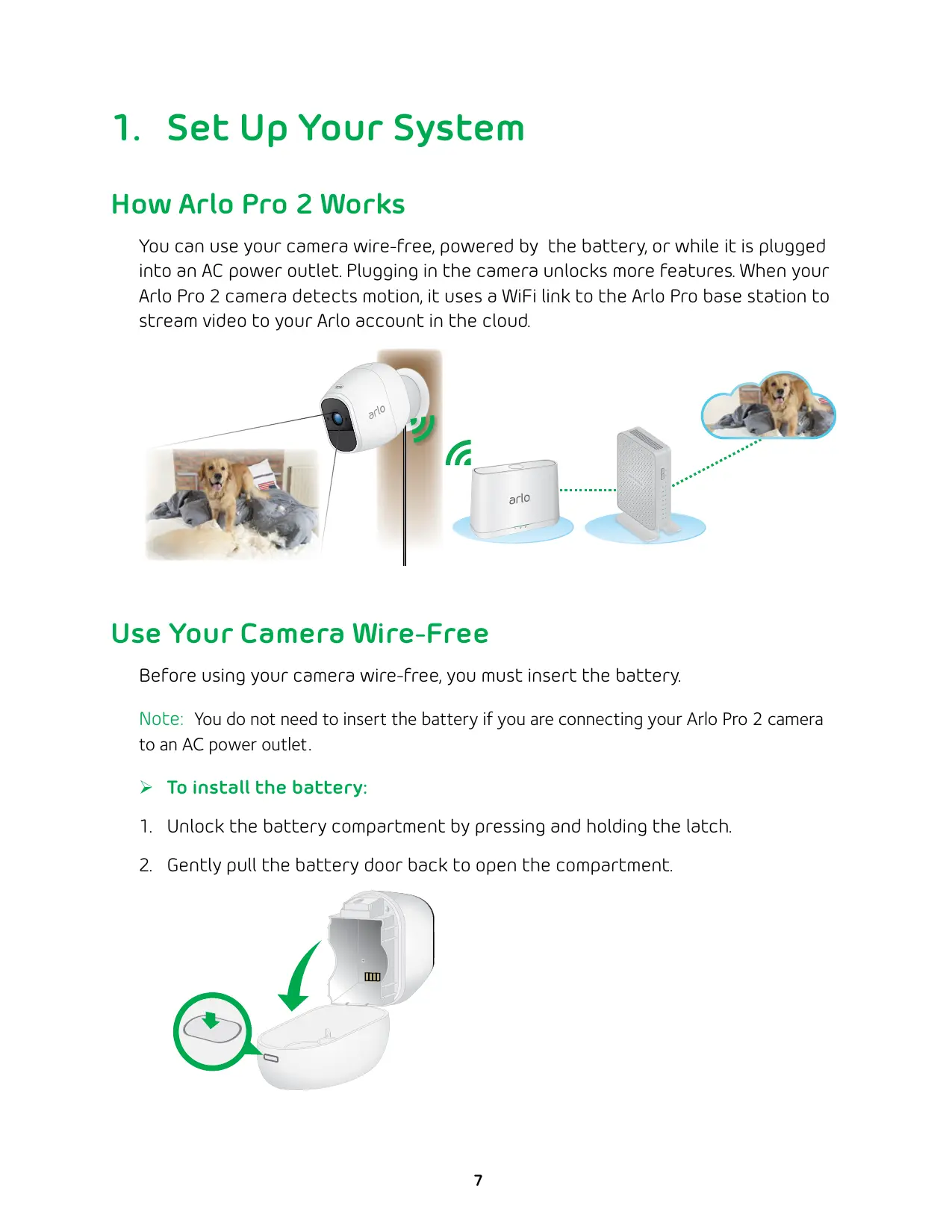 How Arlo Pro 2 Works You can use your camera wire-free, powered by the battery, or while it is plugged into an AC power outlet. Plugging in the camera unlocks more features. When your Arlo Pro 2 camera detects motion, it uses a WiFi link to the Arlo Pro base station to stream video to your Arlo account in the cloud. Use Your Camera Wire-Free Before using your camera wire-free, you must insert the battery. Note: You do not need to insert the battery if you are connecting your Arlo Pro 2 camera to an AC power outlet. ¾¾ To install the battery: