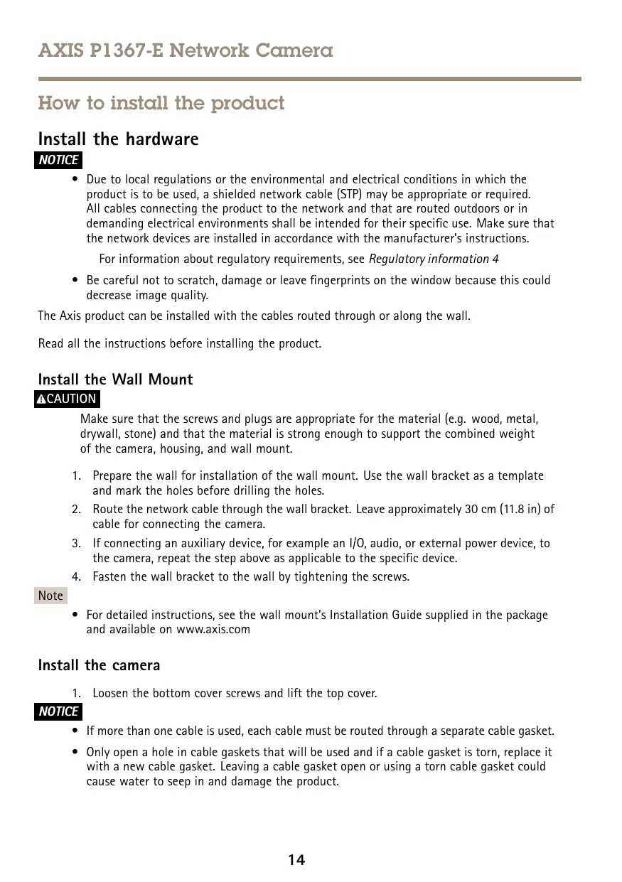 How to install the product Install the hardware NOTICE TICE NO • Due to local regulations or the environmental and electrical conditions in which the product is to be used, a shielded network cable (STP) may be appropriate or required. All cables connecting the product to the network and that are routed outdoors or in demanding electrical environments shall be intended for their specific use. Make sure that the network devices are installed in accordance with the manufacturer’s instructions. For information about regulatory requirements, see Regulatory information 4 • Be careful not to scratch, damage or leave fingerprints on the window because this could decrease image quality. The Axis product can be installed with the cables routed through or along the wall. Read all the instructions before installing the product.