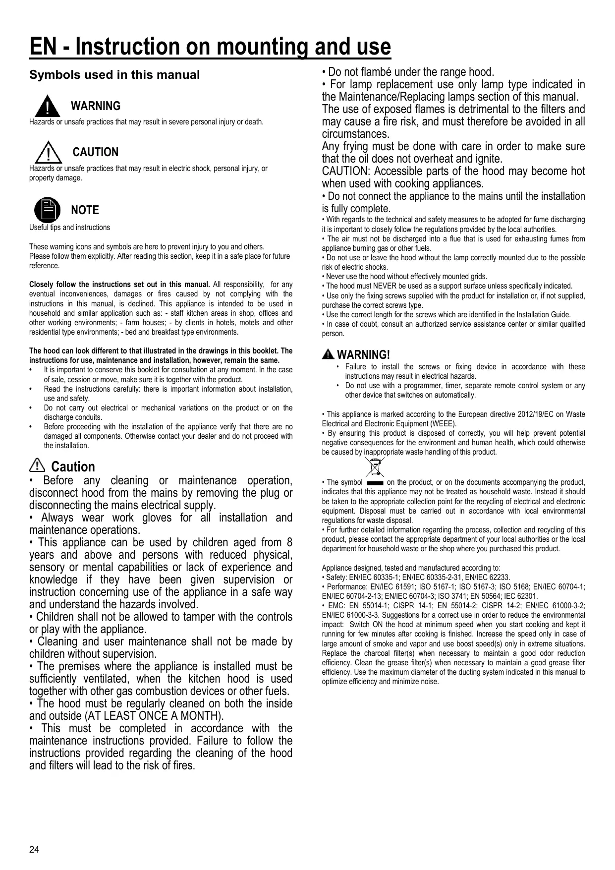 • The symbol indicates that this appliance may not be treated as household waste. Instead it should be taken to the appropriate collection point for the recycling of electrical and electronic equipment. Disposal must be carried out in accordance with local environmental regulations for waste disposal. • For further detailed information regarding the process, collection and recycling of this product, please contact the appropriate department of your local authorities or the local department for household waste or the shop where you purchased this product. Appliance designed, tested and manufactured according to: • Safety: EN/IEC 60335-1; EN/IEC 60335-2-31, EN/IEC 62233. • Performance: EN/IEC 61591; ISO 5167-1; ISO 5167-3; ISO 5168; EN/IEC 60704-1; EN/IEC 60704-2-13; EN/IEC 60704-3; ISO 3741; EN 50564; IEC 62301. • EMC: EN 55014-1; CISPR 14-1; EN 55014-2; CISPR 14-2; EN/IEC 61000-3-2; EN/IEC 61000-3-3. Suggestions for a correct use in order to reduce the environmental impact: Switch ON the hood at minimum speed when you start cooking and kept it running for few minutes after cooking is finished. Increase the speed only in case of large amount of smoke and vapor and use boost speed(s) only in extreme situations. Replace the charcoal filter(s) when necessary to maintain a good odor reduction efficiency. Clean the grease filter(s) when necessary to maintain a good grease filter efficiency. Use the maximum diameter of the ducting system indicated in this manual to optimize efficiency and minimize noise.