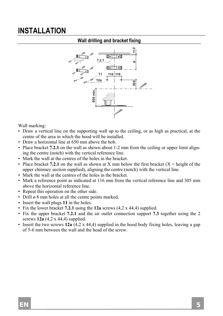 Wall marking: • Draw a vertical line on the supporting wall up to the ceiling, or as high as practical, at the centre of the area in which the hood will be installed. • Draw a horizontal line at 650 mm above the hob. • Place bracket 7.2.1 on the wall as shown about 1-2 mm from the ceiling or upper limit aligning the centre (notch) with the vertical reference line. • Mark the wall at the centres of the holes in the bracket. • Place bracket 7.2.1 on the wall as shown at X mm below the first bracket (X = height of the upper chimney section supplied), aligning the centre (notch) with the vertical line. • Mark the wall at the centres of the holes in the bracket. • Mark a reference point as indicated at 116 mm from the vertical reference line and 305 mm above the horizontal reference line. • Repeat this operation on the other side. • Drill ø 8 mm holes at all the centre points marked. • Insert the wall plugs 11 in the holes. • Fix the lower bracket 7.2.1 using the 12a screws (4,2 x 44,4) supplied. • Fix the upper bracket 7.2.1 and the air outlet connection support 7.3 together using the 2 screws 12a (4,2 x 44,4) supplied. • Insert the two screws 12a (4,2 x 44,4) supplied in the hood body fixing holes, leaving a gap of 5-6 mm between the wall and the head of the screw.