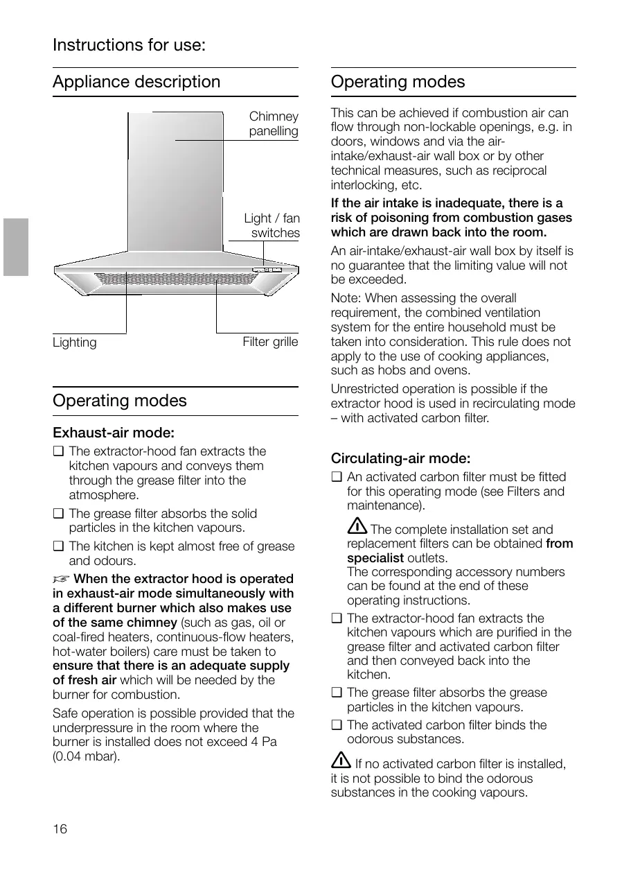 If the air intake is inadequate, there is a risk of poisoning from combustion gases which are drawn back into the room. An air-intake/exhaust-air wall box by itself is no guarantee that the limiting value will not be exceeded. Note: When assessing the overall requirement, the combined ventilation system for the entire household must be taken into consideration. This rule does not apply to the use of cooking appliances, such as hobs and ovens. Unrestricted operation is possible if the extractor hood is used in recirculating mode – with activated carbon filter.