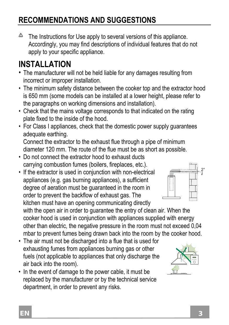 CONSIGLI E SUGGERIMENTI Le Istruzioni per l’uso si riferiscono ai diversi modelli di questo apparecchio. Pertanto, si potrebbero trovare descrizioni di singole caratteristiche che non appartengono al proprio apparecchio specifico. Assurez-vous que la tension de votre secteur correspond à celle indiquée sur la plaque des données appliquée à l’intérieur de la hotte. Pour les appareils de Classe I, s’assurer que l’installation électrique de votre intérieur dispose d’une mise à la terre adéquate. Relier l’aspirateur au conduit de cheminée avec un tube d’un diamètre minimum de 120 mm. Le parcours des fumées doit être le plus court possible. Ne pas relier la hotte aspirante aux conduits de cheminée qui 2° acheminent les fumées de combustion (par exemple de chaudières, de cheminées, etc.). Si vous utilisez l’aspirateur en combinaison avec des appareils non électriques (par ex. appareils à gaz), vous devez garantir un degré d’aération suffisant dans la pièce, afin d’empêcher le retour du flux des gaz de sortie. La cuisine doit présenter une ouverture communiquant directement vers l’extérieur pour garantir l’amenée d’air propre. Si vous utilisez la hotte de cuisine en combinaison avec des appareils non alimentés à l’électricité, la pression négative dans la pièce ne doit pas dépasser 0,04 mbar afin d’éviter que la hotte ne réaspire les fumées dans la pièce. Ne pas évacuer l’air à travers un tube flexible utilisé pour l’aspiration des fumées des appareils alimentés au gaz ou avec d’autres combustibles (ne pas utiliser avec des appareils ayant une seule sortie d’air dans la pièce). Si le cordon d’alimentation est endommagé, veuillez le faire remplacer par le fabricant ou par un service après-vente agréé pour éviter tout risque d’accident.