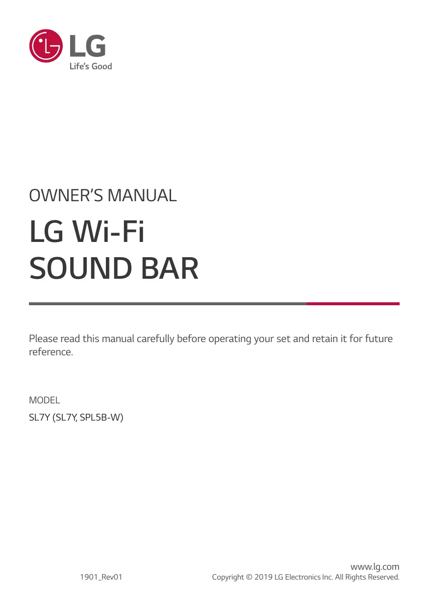 LG Wi-Fi SOUND BAR Please read this manual carefully before operating your set and retain it for future reference. MODEL SL7Y (SL7Y, SPL5B-W) 1901_Rev01 www.lg.com Copyright © 2019 LG Electronics Inc. All Rights Reserved.