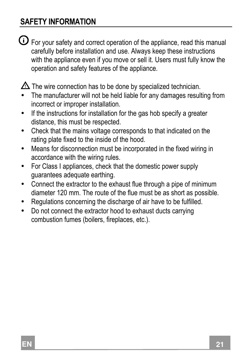 SAFETY INFORMATION For your safety and correct operation of the appliance, read this manual carefully before installation and use. Always keep these instructions with the appliance even if you move or sell it. Users must fully know the operation and safety features of the appliance. The wire connection has to be done by specialized technician. • The manufacturer will not be held liable for any damages resulting from incorrect or improper installation. • If the instructions for installation for the gas hob specify a greater distance, this must be respected. • Check that the mains voltage corresponds to that indicated on the rating plate fixed to the inside of the hood. • Means for disconnection must be incorporated in the fixed wiring in accordance with the wiring rules. • For Class I appliances, check that the domestic power supply guarantees adequate earthing. • Connect the extractor to the exhaust flue through a pipe of minimum diameter 120 mm. The route of the flue must be as short as possible. • Regulations concerning the discharge of air have to be fulfilled. • Do not connect the extractor hood to exhaust ducts carrying combustion fumes (boilers, fireplaces, etc.).