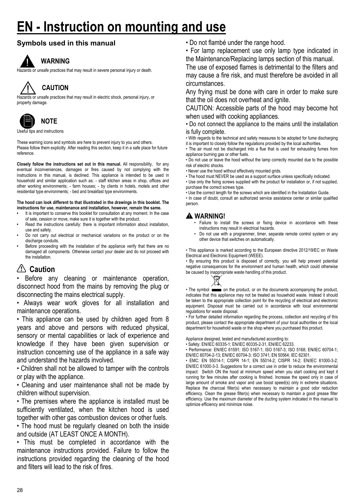 • The symbol indicates that this appliance may not be treated as household waste. Instead it should be taken to the appropriate collection point for the recycling of electrical and electronic equipment. Disposal must be carried out in accordance with local environmental regulations for waste disposal. • For further detailed information regarding the process, collection and recycling of this product, please contact the appropriate department of your local authorities or the local department for household waste or the shop where you purchased this product. Appliance designed, tested and manufactured according to: • Safety: EN/IEC 60335-1; EN/IEC 60335-2-31, EN/IEC 62233. • Performance: EN/IEC 61591; ISO 5167-1; ISO 5167-3; ISO 5168; EN/IEC 60704-1; EN/IEC 60704-2-13; EN/IEC 60704-3; ISO 3741; EN 50564; IEC 62301. • EMC: EN 55014-1; CISPR 14-1; EN 55014-2; CISPR 14-2; EN/IEC 61000-3-2; EN/IEC 61000-3-3. Suggestions for a correct use in order to reduce the environmental impact: Switch ON the hood at minimum speed when you start cooking and kept it running for few minutes after cooking is finished. Increase the speed only in case of large amount of smoke and vapor and use boost speed(s) only in extreme situations. Replace the charcoal filter(s) when necessary to maintain a good odor reduction efficiency. Clean the grease filter(s) when necessary to maintain a good grease filter efficiency. Use the maximum diameter of the ducting system indicated in this manual to optimize efficiency and minimize noise.