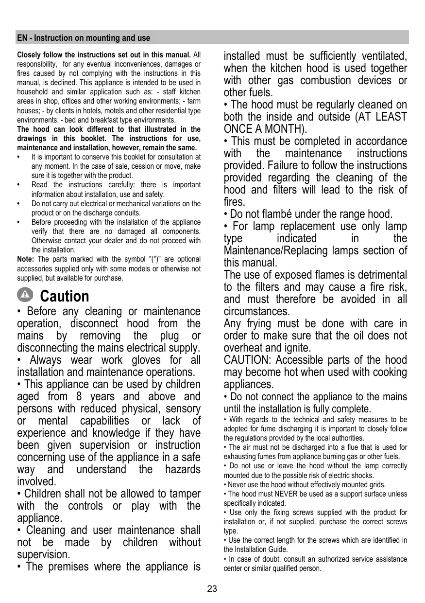 - For lamp replacement use only lamp type indicated the Maintenance/Replacing lamps section of this manual. The use of exposed flames is detrimental to the filters and may cause a fire risk, and must therefore be avoided in all circumstances. Any frying must be done with care in order to make sure that the oil does not overheat and ignite. CAUTION: Accessible parts of the hood may become hot when used with cooking appliances. Closely follow the instructions set out in this manual. All responsibility, for any eventual inconveniences, damages or fires caused by not complying with the instructions in this manual, is declined. This appliance is intended to be used in household and similar application such as: - staff kitchen areas in shop, offices and other working environments; - farm houses; - by clients in hotels, motels and other residential type environments; - bed and breakfast type environments. The hood can look different to that illustrated in the drawings in this booklet. The instructions for use, maintenance and installation, however, remain the same.