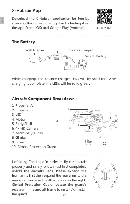 X-Hubsan App E N Download the X-Hubsan application for free by scanning the code on the right or by finding it on the App Store (iOS) and Google Play (Android). X-Hubsan The Battery Wall Adapter Balance Charger Aircraft Battery While charging, the balance charger LEDs will be solid red. When charging is complete, the LEDs will be solid green. Unfolding The Legs: In order to fly the aircraft properly and safely, pilots must first completely unfold the aircraft's legs. Please expand the front arms first then expand the rear arms to the maximum angle as the illlustration on the right. Gimbal Protection Guard: Locate the guard's recesses in the aircraft frame to install / uninstall the guard.