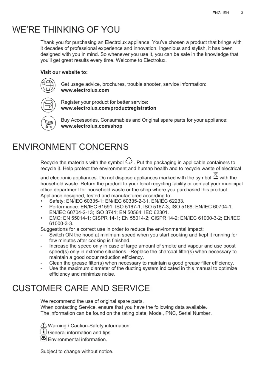 - EMC: EN 55014-1; CISPR 14-1; EN 55014-2; CISPR 14-2; EN/IEC 61000-3-2; EN/IEC 61000-3-3. Suggestions for a correct use in order to reduce the environmental impact: - Switch ON the hood at minimum speed when you start cooking and kept it running for few minutes after cooking is finished. - Increase the speed only in case of large amount of smoke and vapour and use boost speed(s) only in extreme situations. -Replace the charcoal filter(s) when necessary to maintain a good odour reduction efficiency. - Clean the grease filter(s) when necessary to maintain a good grease filter efficiency. - Use the maximum diameter of the ducting system indicated in this manual to optimize efficiency and minimize noise.