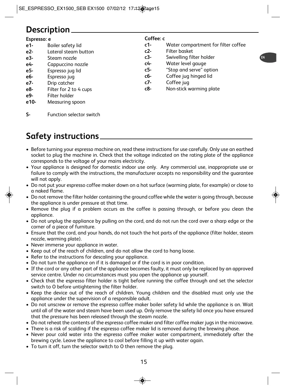 Never remove the boiler safety lid (e1) or the filter holder (e9) while the appliance is in the “ON” position and while the boiler is under pressure. Never move or remove the filter holder while the appliance is working and under pressure. Follow the instructions below to check whether the appliance is still under pressure. Respect these safety measures while the machine is working and for 10 to 15 minutes after it has been used. Turn the function selector switch (S) to “OFF”. Carefully open the steam button (e2) by turning it anticlockwise. If steam comes out of the nozzle, the boiler is still under pressure. Close the steam button and follow the instructions below. Take a jug of cold water and place the steam nozzle inside it. Turn the steam button (e2) on by turning it anticlockwise. Leave the button open until there is no steam left. Stop the steam function by turning the button clockwise. Now remove the lid of the boiler and the filter holder. A real espresso Espresso is a coffee that is much richer and fuller-flavoured than ordinary filter coffee. It must be unctuous, dark and flavourful. Most people prefer to take it in small contents, because it is such a rich drink. It is for this reason that espresso coffee is usually served in small cups (60 to 80 ml) which are only half-filled. When this appliance is used properly, you will get an espresso that is unctuous, dark and flavourful. All you need to do is follow the instructions and use well