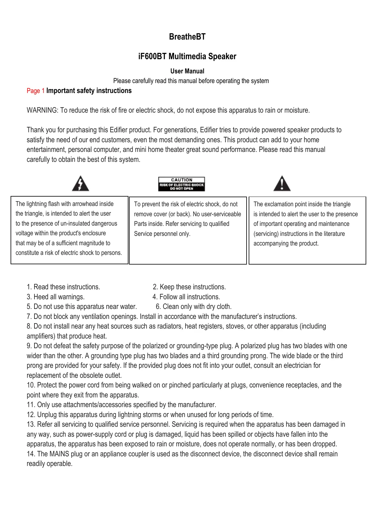 BreatheBT iF600BT Multimedia Speaker User Manual Please carefully read this manual before operating the system Page 1 Important safety instructions
