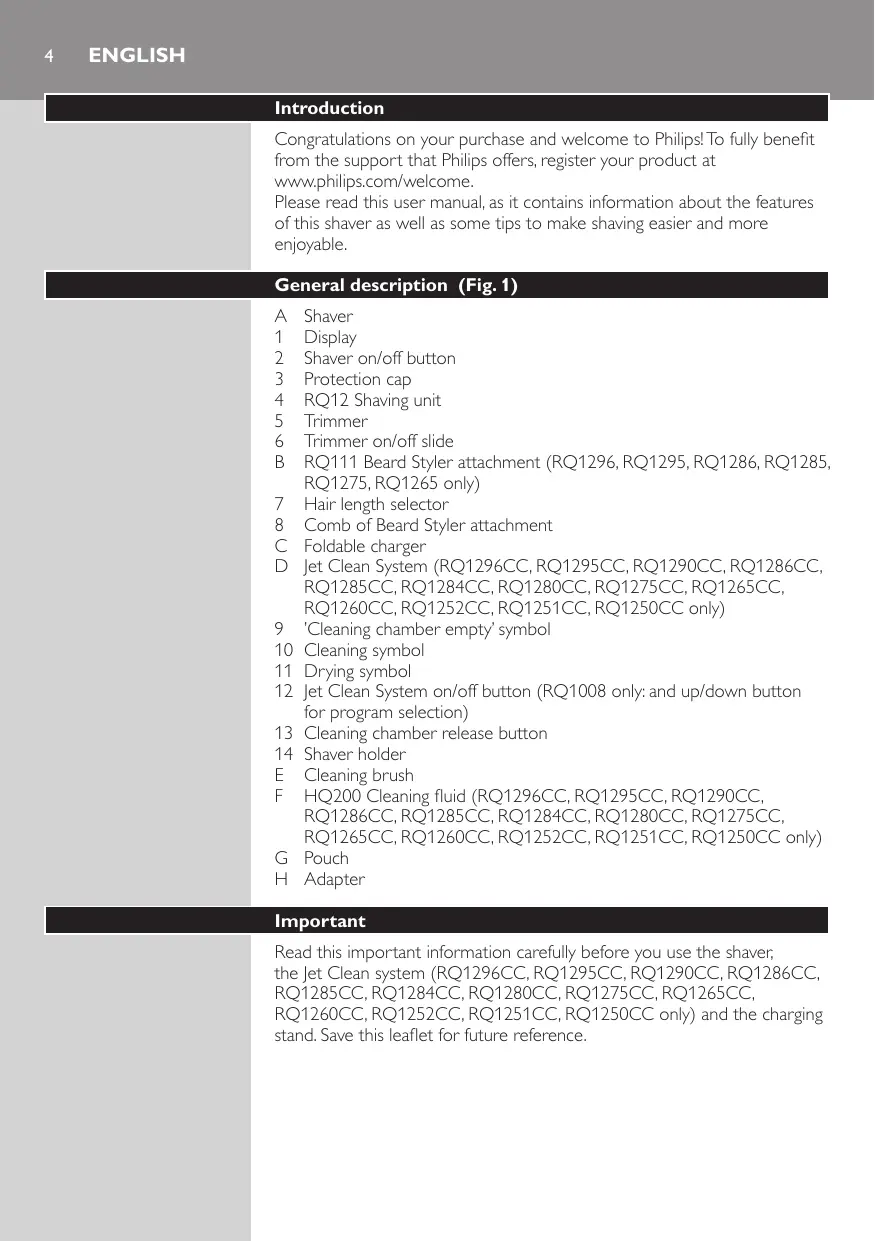 Shaver Display Shaver on/off button Protection cap RQ12 Shaving unit Trimmer Trimmer on/off slide RQ111 Beard Styler attachment (RQ1296, RQ1295, RQ1286, RQ1285, RQ1275, RQ1265 only) Hair length selector Comb of Beard Styler attachment Foldable charger Jet Clean System (RQ1296CC, RQ1295CC, RQ1290CC, RQ1286CC, RQ1285CC, RQ1284CC, RQ1280CC, RQ1275CC, RQ1265CC, RQ1260CC, RQ1252CC, RQ1251CC, RQ1250CC only) ’Cleaning chamber empty’ symbol Cleaning symbol Drying symbol Jet Clean System on/off button (RQ1008 only: and up/down button for program selection) Cleaning chamber release button Shaver holder Cleaning brush HQ200 Cleaning fluid (RQ1296CC, RQ1295CC, RQ1290CC, RQ1286CC, RQ1285CC, RQ1284CC, RQ1280CC, RQ1275CC, RQ1265CC, RQ1260CC, RQ1252CC, RQ1251CC, RQ1250CC only) Pouch Adapter Important Read this important information carefully before you use the shaver, the Jet Clean system (RQ1296CC, RQ1295CC, RQ1290CC, RQ1286CC, RQ1285CC, RQ1284CC, RQ1280CC, RQ1275CC, RQ1265CC, RQ1260CC, RQ1252CC, RQ1251CC, RQ1250CC only) and the charging stand. Save this leaflet for future reference. ENGLISH