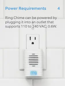 Power Requirements Ring Chime can be powered by plugging it into an outlet that supports 110 to 240 VAC; 0.6W.