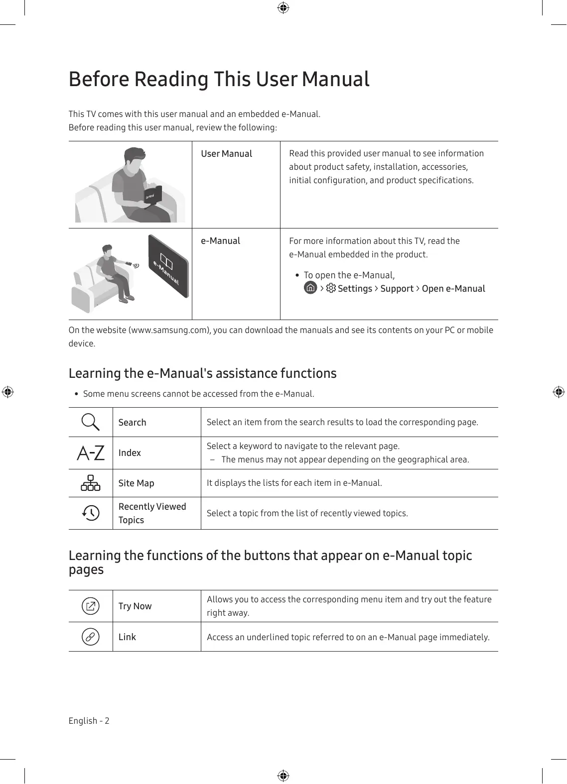 - • To open the e-Manual, > Settings > Support > Open e-Manual On the website (www.samsung.com), you can download the manuals and see its contents on your PC or mobile device. Learning the e-Manual's assistance functions