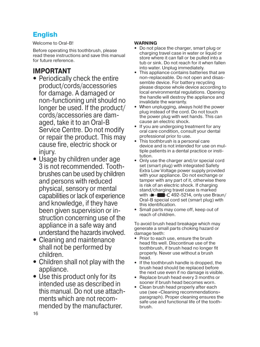 • Do not place the charger, smart plug or charging travel case in water or liquid or store where it can fall or be pulled into a tub or sink. Do not reach for it when fallen into water. Unplug immediately. • This appliance contains batteries that are non-replaceable. Do not open and disassemble device. For battery recycling please dispose whole device according to local environmental regulations. Opening the handle will destroy the appliance and invalidate the warranty. • When unplugging, always hold the power plug instead of the cord. Do not touch the power plug with wet hands. This can cause an electric shock. • If you are undergoing treatment for any oral care condition, consult your dental professional prior to use. • This toothbrush is a personal care device and is not intended for use on multiple patients in a dental practice or institution. • Only use the charger and/or special cord set (smart plug) with integrated Safety Extra Low Voltage power supply provided with your appliance. Do not exchange or tamper with any part of it, otherwise there is risk of an electric shock. If charging stand/charging travel case is marked 492-5214, only use Braun/ with Oral-B special cord set (smart plug) with this identification. • Small parts may come off, keep out of reach of children. To avoid brush head breakage which may generate a small parts choking hazard or damage teeth: • Prior to each use, ensure the brush head fits well. Discontinue use of the toothbrush, if brush head no longer fit properly. Never use without a brush head. • If the toothbrush handle is dropped, the brush head should be replaced before the next use even if no damage is visible. • Replace brush head every 3 months or sooner if brush head becomes worn. • Clean brush head properly after each use (see «Cleaning recommendations» paragraph). Proper cleaning ensures the safe use and functional life of the toothbrush.