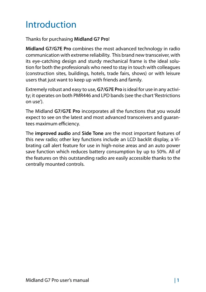 |C Introduction Thanks for purchasing Midland G7 Pro! Midland G7/G7E Pro combines the most advanced technology in radio communication with extreme reliability. This brand new transceiver, with its eye-catching design and sturdy mechanical frame is the ideal solution for both the professionals who need to stay in touch with colleagues (construction sites, buildings, hotels, trade fairs, shows) or with leisure users that just want to keep up with friends and family. Extremely robust and easy to use, G7/G7E Pro is ideal for use in any activity; it operates on both PMR446 and LPD bands (see the chart ‘Restrictions on use’). The Midland G7/G7E Pro incorporates all the functions that you would expect to see on the latest and most advanced transceivers and guarantees maximum efficiency. The improved audio and Side Tone are the most important features of this new radio; other key functions include an LCD backlit display, a Vibrating call alert feature for use in high-noise areas and an auto power save function which reduces battery consumption by up to 50%. All of the features on this outstanding radio are easily accessible thanks to the centrally mounted controls.