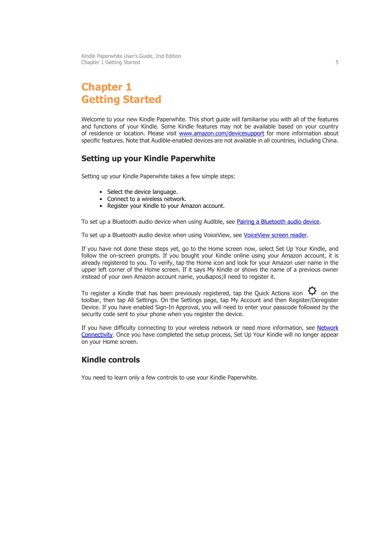 Setting up your Kindle Paperwhite Setting up your Kindle Paperwhite takes a few simple steps: • Select the device language. • Connect to a wireless network. • Register your Kindle to your Amazon account. To set up a Bluetooth audio device when using Audible, see Pairing a Bluetooth audio device. To set up a Bluetooth audio device when using VoiceView, see VoiceView screen reader. If you have not done these steps yet, go to the Home screen now, select Set Up Your Kindle, and follow the on-screen prompts. If you bought your Kindle online using your Amazon account, it is already registered to you. To verify, tap the Home icon and look for your Amazon user name in the upper left corner of the Home screen. If it says My Kindle or shows the name of a previous owner instead of your own Amazon account name, you'll need to register it. To register a Kindle that has been previously registered, tap the Quick Actions icon on the toolbar, then tap All Settings. On the Settings page, tap My Account and then Register/Deregister Device. If you have enabled Sign-In Approval, you will need to enter your passcode followed by the security code sent to your phone when you register the device. If you have difficulty connecting to your wireless network or need more information, see Network Connectivity. Once you have completed the setup process, Set Up Your Kindle will no longer appear on your Home screen.