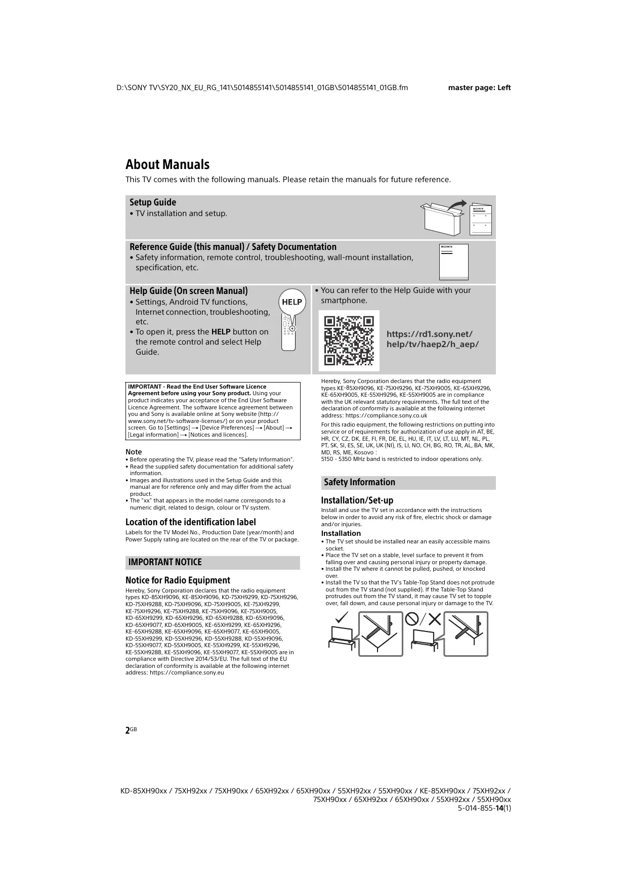 - You can refer to the Help Guide with your smartphone. https://rd1.sony.net/ help/tv/haep2/h_aep/ Hereby, Sony Corporation declares that the radio equipment types KE-85XH9096, KE-75XH9296, KE-75XH9005, KE-65XH9296, KE-65XH9005, KE-55XH9296, KE-55XH9005 are in compliance with the UK relevant statutory requirements. The full text of the declaration of conformity is available at the following internet address: https://compliance.sony.co.uk For this radio equipment, the following restrictions on putting into service or of requirements for authorization of use apply in AT, BE, HR, CY, CZ, DK, EE, FI, FR, DE, EL, HU, IE, IT, LV, LT, LU, MT, NL, PL, PT, SK, SI, ES, SE, UK, UK (NI), IS, LI, NO, CH, BG, RO, TR, AL, BA, MK, MD, RS, ME, Kosovo : 5150 - 5350 MHz band is restricted to indoor operations only. Safety Information Installation/Set-up Install and use the TV set in accordance with the instructions below in order to avoid any risk of fire, electric shock or damage and/or injuries. Installation