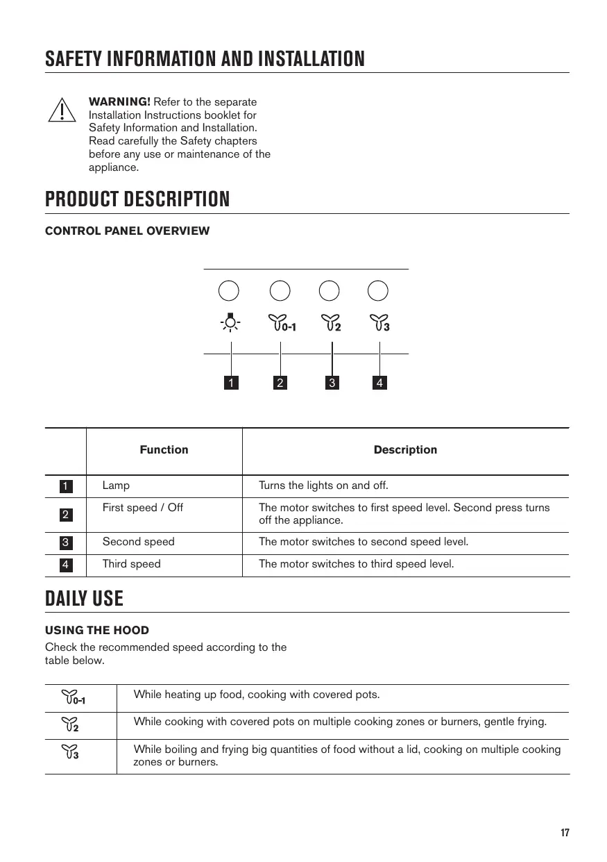DAILY USE USING THE HOOD Check the recommended speed according to the table below.