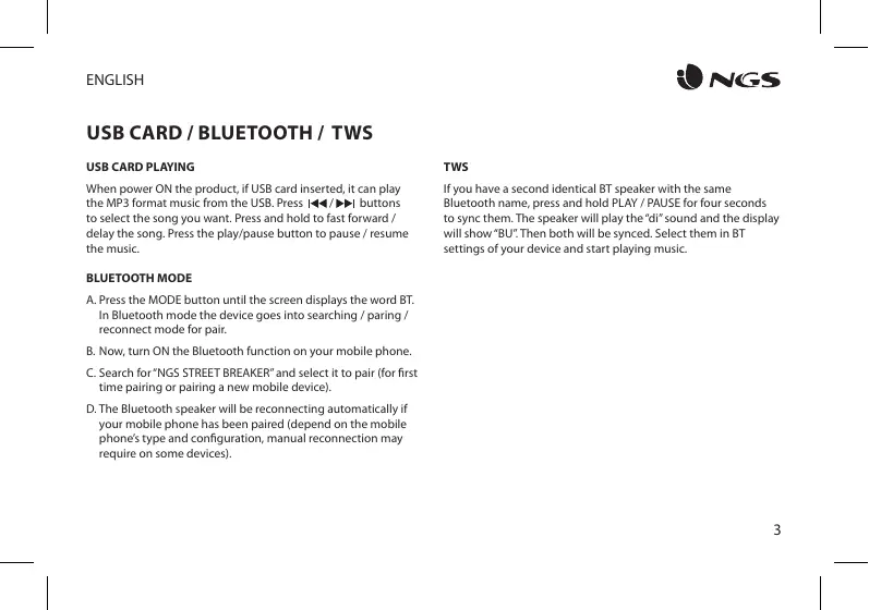 In Bluetooth mode the device goes into searching / paring / reconnect mode for pair. B. Now, turn ON the Bluetooth function on your mobile phone. C. Search for “NGS STREET BREAKER” and select it to pair (for first time pairing or pairing a new mobile device). D. The Bluetooth speaker will be reconnecting automatically if your mobile phone has been paired (depend on the mobile phone’s type and configuration, manual reconnection may require on some devices).