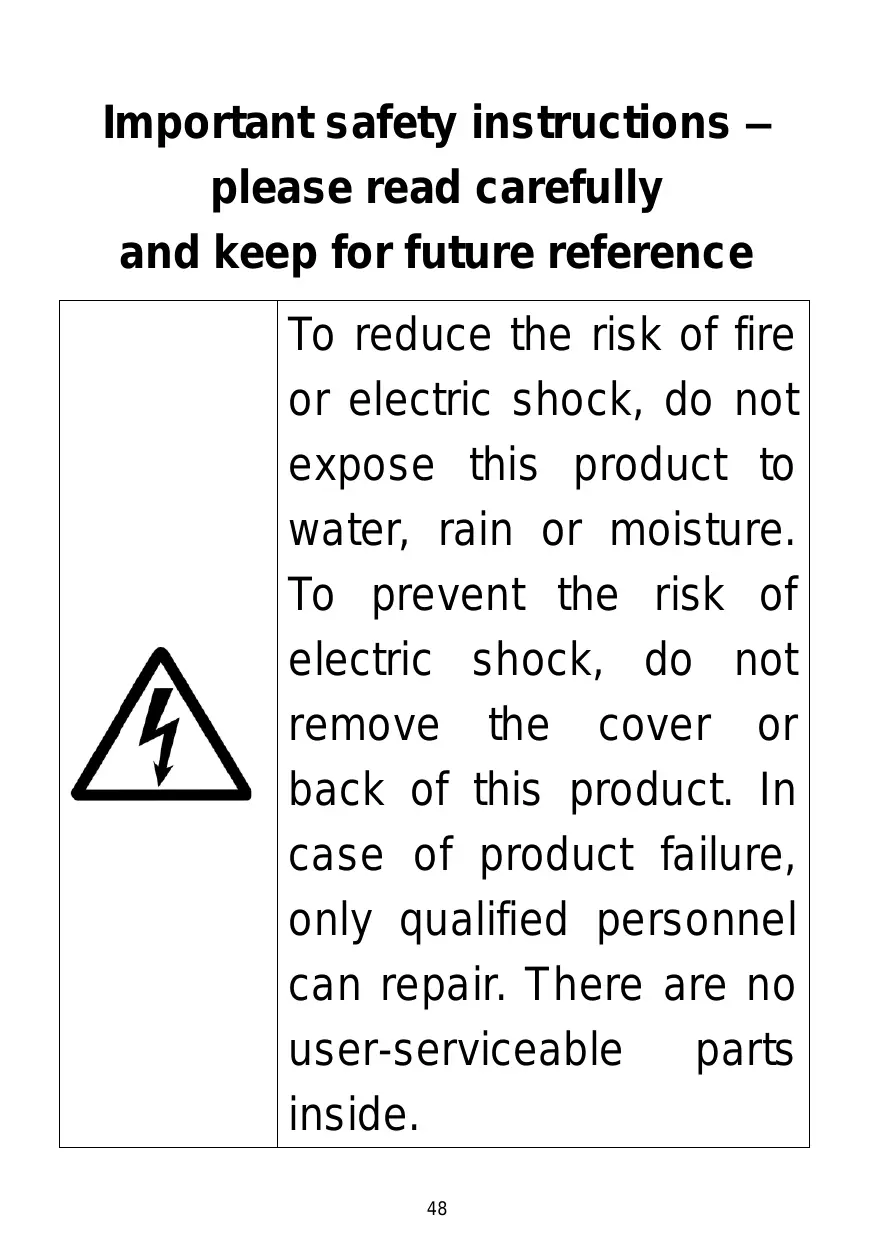 Important safety instructions – please read carefully and keep for future reference To reduce the risk of fire or electric shock, do not expose this product to water, rain or moisture. To prevent the risk of electric shock, do not remove the cover or back of this product. In case of product failure, only qualified personnel can repair. There are no user-serviceable parts inside. 48