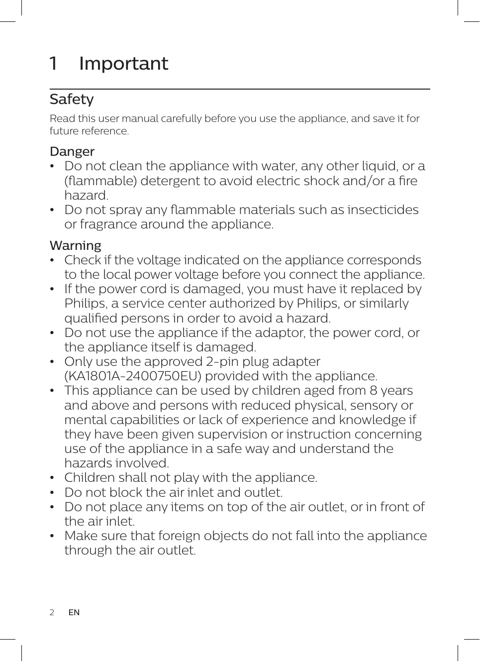 • Do not clean the appliance with water, any other liquid, or a (flammable) detergent to avoid electric shock and/or a fire hazard. • Do not spray any flammable materials such as insecticides or fragrance around the appliance. Warning • Check if the voltage indicated on the appliance corresponds to the local power voltage before you connect the appliance. • If the power cord is damaged, you must have it replaced by Philips, a service center authorized by Philips, or similarly qualified persons in order to avoid a hazard. • Do not use the appliance if the adaptor, the power cord, or the appliance itself is damaged. • Only use the approved 2-pin plug adapter (KA1801A-2400750EU) provided with the appliance. • This appliance can be used by children aged from 8 years and above and persons with reduced physical, sensory or mental capabilities or lack of experience and knowledge if they have been given supervision or instruction concerning use of the appliance in a safe way and understand the hazards involved. • Children shall not play with the appliance. • Do not block the air inlet and outlet. • Do not place any items on top of the air outlet, or in front of the air inlet. • Make sure that foreign objects do not fall into the appliance through the air outlet.