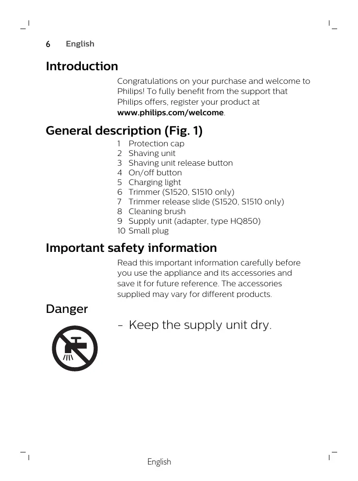 Protection cap Shaving unit Shaving unit release button On/off button Charging light Trimmer (S1520, S1510 only) Trimmer release slide (S1520, S1510 only) Cleaning brush Supply unit (adapter, type HQ850) Small plug