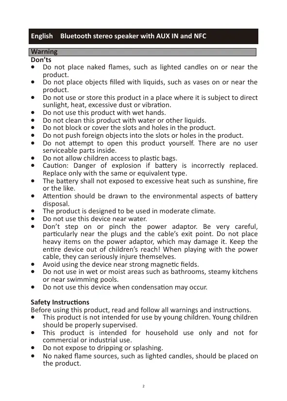 Bluetooth stereo speaker with AUX IN and NFC HANDLEIDING English Bluetooth stereo speaker with AUX IN and NFC Warning Don’ts