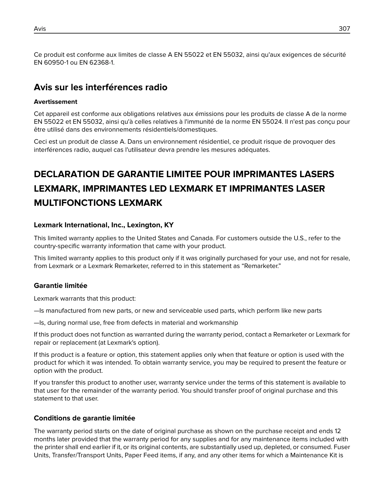 Garantie limitée Lexmark warrants that this product: —Is manufactured from new parts, or new and serviceable used parts, which perform like new parts —Is, during normal use, free from defects in material and workmanship If this product does not function as warranted during the warranty period, contact a Remarketer or Lexmark for repair or replacement (at Lexmark's option). If this product is a feature or option, this statement applies only when that feature or option is used with the product for which it was intended. To obtain warranty service, you may be required to present the feature or option with the product. If you transfer this product to another user, warranty service under the terms of this statement is available to that user for the remainder of the warranty period. You should transfer proof of original purchase and this statement to that user.